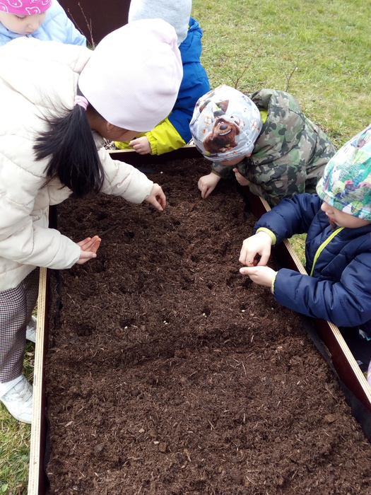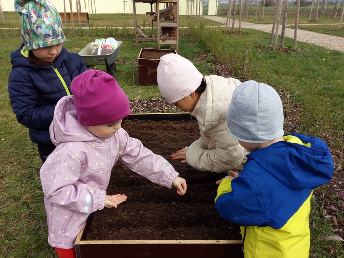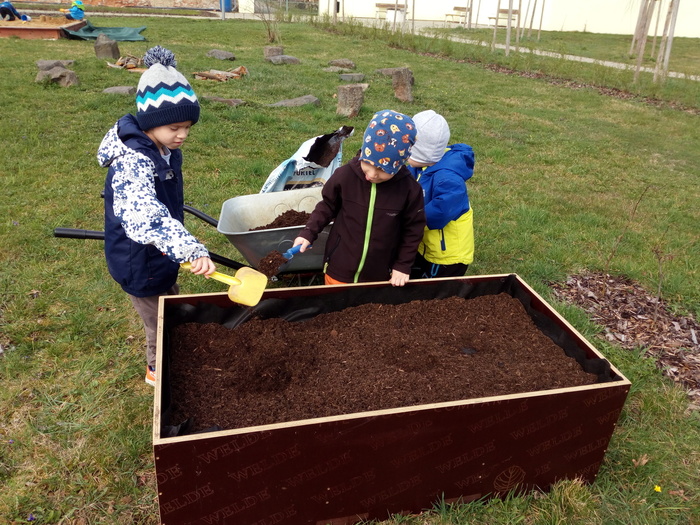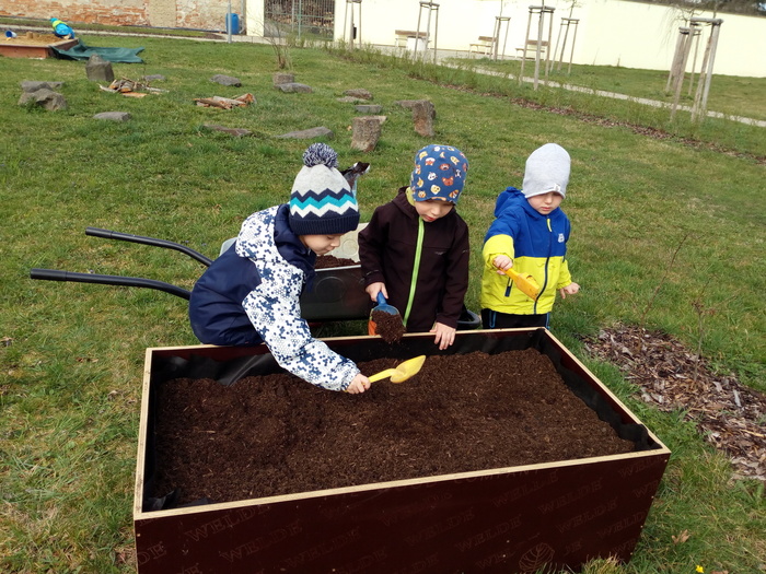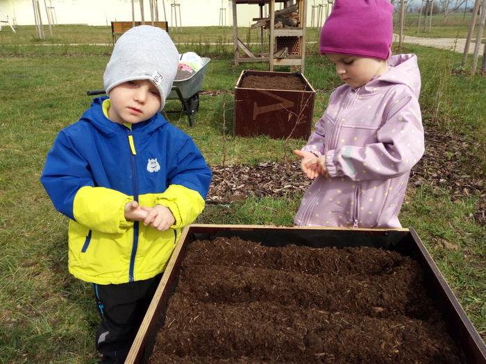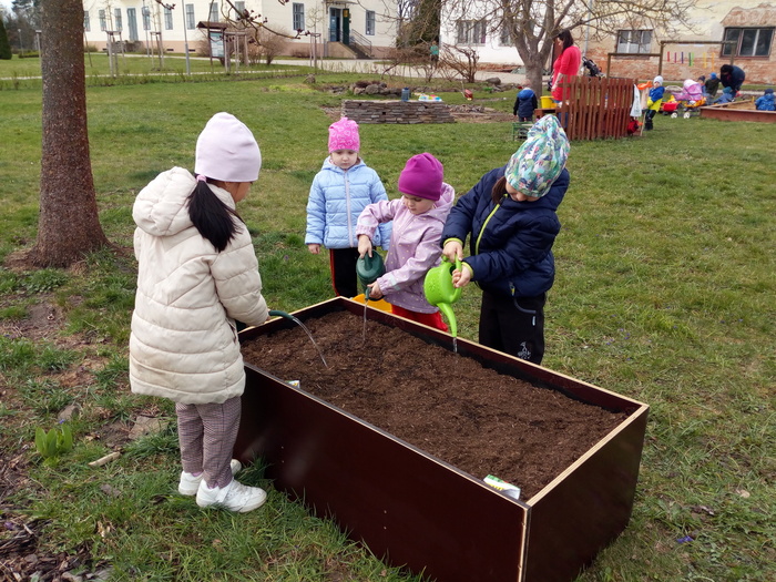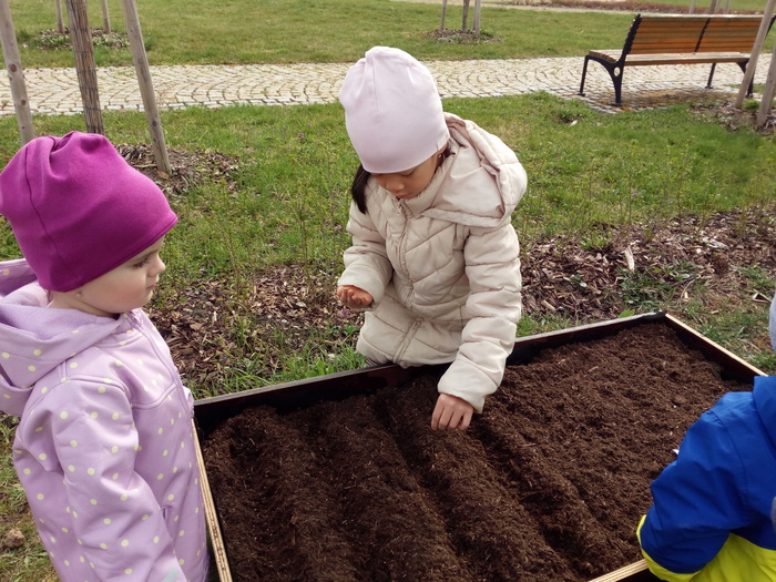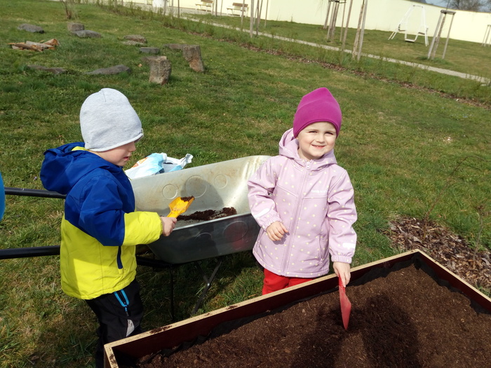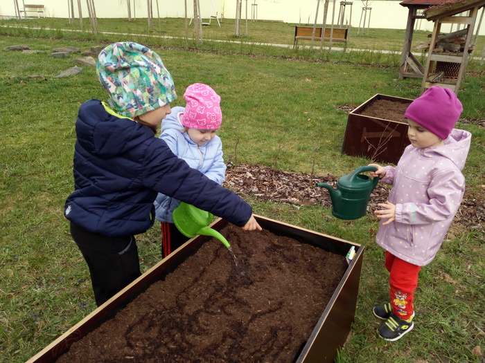 Na jaře se ani naše děti neleknou zahradničení... Do vyvýšených záhonů připravily zeminu, vysely semena mrkvičky, ředkviček a hrášku. Ve spolupráci se sluníčkem a deštíkem budeme pozorovat růst rostlin a věříme, že zanedlouho budeme sklízet zeleninovou úrodu.