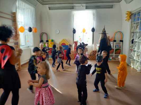 Dušičkový týden se nesl v duchu seznamování se svátkem Památka zesnulých - dušičky. V Americe mají Helloween, u nás Dušičky. Děti tvořily, zpívaly, tančily, navštívily místo klidu zesnulých a pozorovaly květinové výzdoby, svítící svíce. V MŠ jsme si vyzdobili prostory chodeb i tříd a v pátek jsme celý týden zakončili podzimním karnevalem. Ochotné maminky přinesly pro děti dobroty, které jsme během karnevalového řádění smlsali.