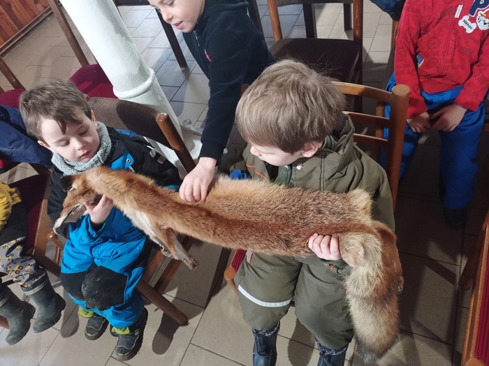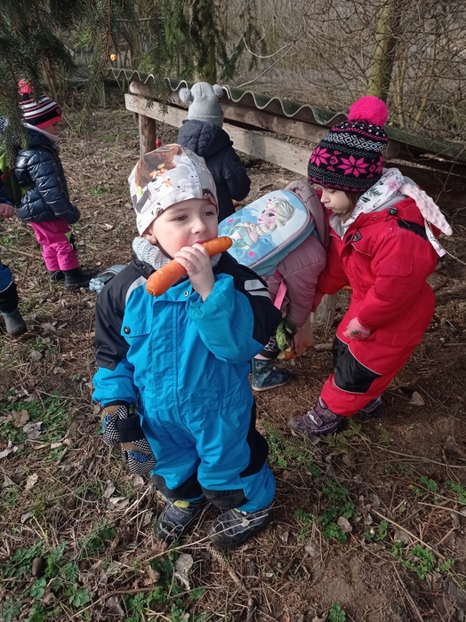 Na konci zimního období jsme se společně s myslivci z Citova sešli na zdejší myslivně. Filip Jirsa si pro děti připravil zajímavý a poučný výklad k životu v lese i u lesa, o činnosti myslivců a lesníků. Děti shlédly vycpaniny lesní zvěře i obrazový materiál, ohmataly si kožešiny lesních zvířat, seznámily se a manipulovaly s pomůckami potřebnými pro práci v lese. Největší radost měly děti z vycházky ke krmelci. Dobroty - mrkvičky, jablíčka, kukuřici, jsme zanesli do nedalekého krmelce a pochutnala si nejen zvířátka.....Enviromentální aktivity jsou nedílnou součástí ŠVP MŠ.
